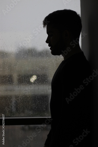 Silhouette Of A Man Sitting In The Window With Rain In Mood Of Sadness And Depression Buy This Stock Photo And Explore Similar Images At Adobe Stock Adobe Stock - Scegli tra immagini premium su looking out window rain della migliore qualita.